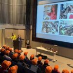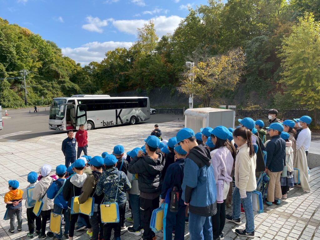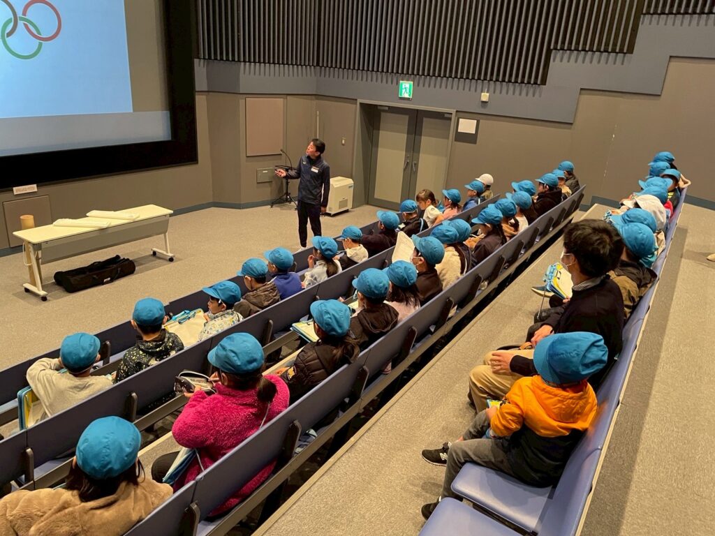 伏見小学校の皆さんがオリンピックミュージアムに来てくれました。最近、大倉山にクマが出没したとの情報で、子供たちはミュージアム玄関前でバスを乗降する対策をとってます。講師はスピードスケートの鈴木靖さん、阿部雅司名誉館長もサポートしてくれて豪華な教室となりました。