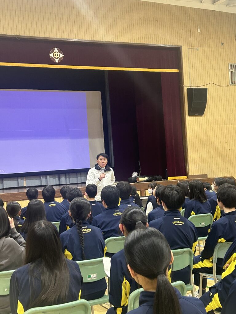 オリパラ教育 新川中学校でオリンピアン講演 2026.02.10 新川中学校でオリンピアンによる講演を行いました。講師はスピードスケートの鈴木靖さん、オリンピックから学ぶ人間性と夢の実現のためのお話をしてくれました。